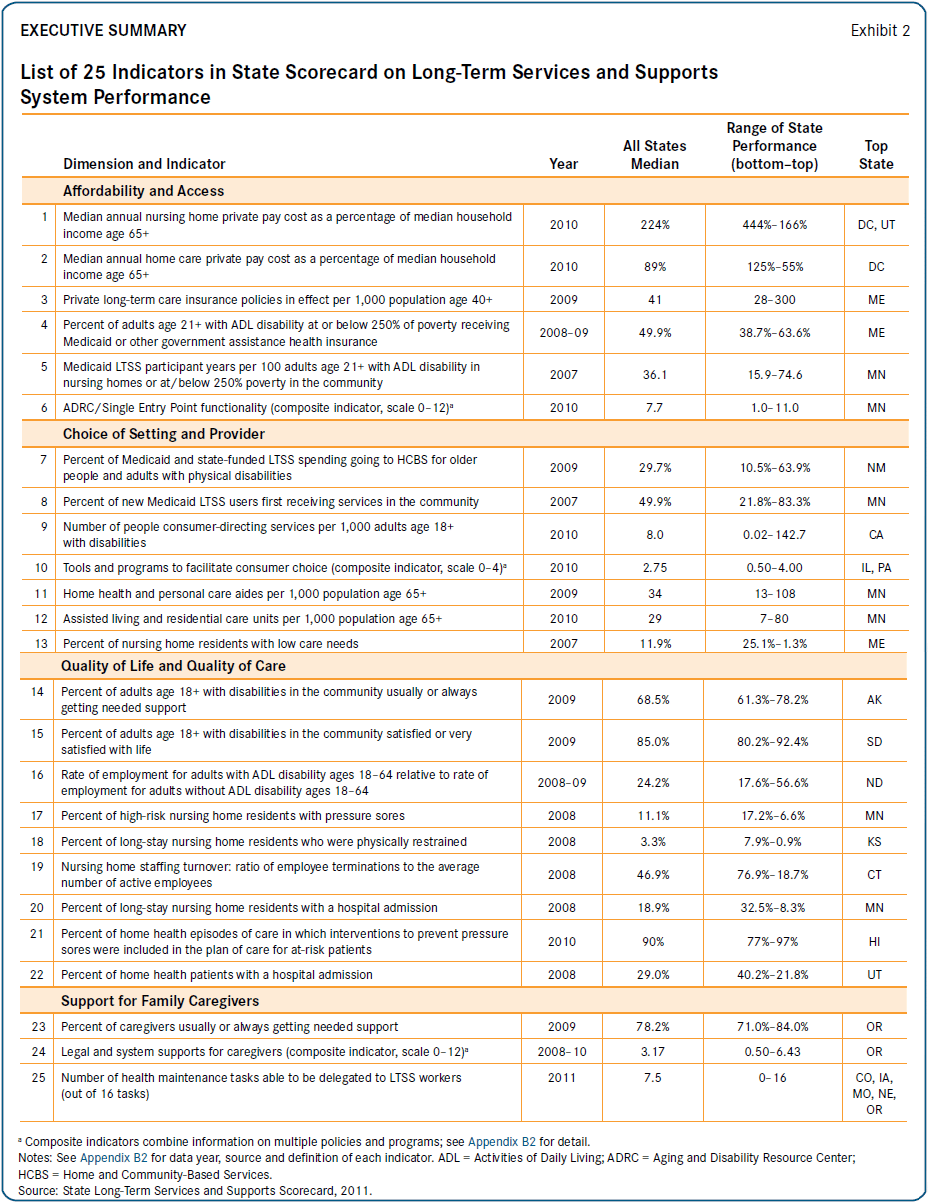 Within the four dimensions, the Scorecard includes 25 indicators. Exhibit 2 lists the indicators that compose each dimension and shows the range of performance across the states for each indicator. While some of the indicators rely on data that have been reported elsewhere, many represent new measures. Several indicators are constructed from a range of data in a related area, facilitating the ability to rank states in areas of performance that are difficult to assess. As such, the findings differ from analyses that examine a single aspect of states' LTSS systems, such as the "balance" of public services provided in home- and community-based settings compared to nursing homes. This multidimensional analysis involves a richer exploration of data to assess performance, thereby capturing state performance across a complex range of system characteristics.