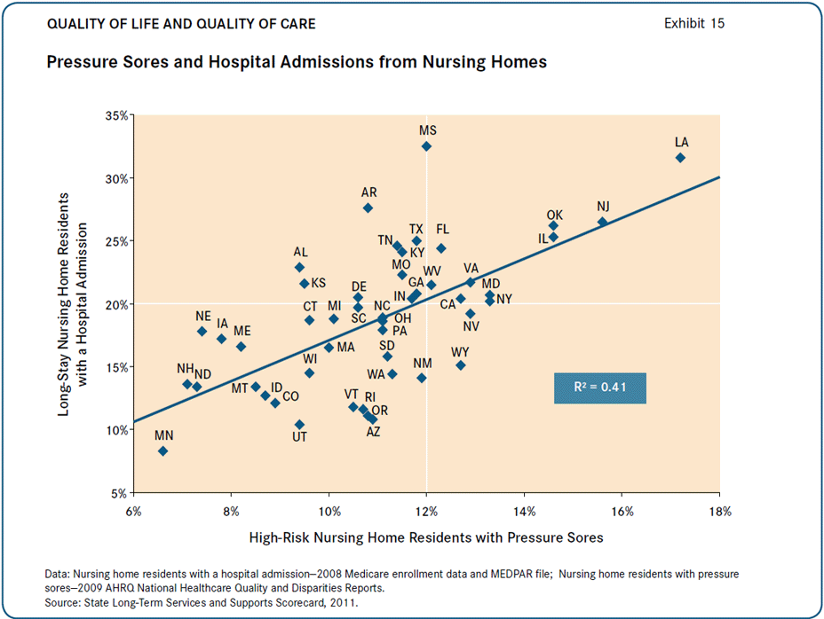Better quality of care can be cost-effective as well. For example, there is a strong correlation between occurrence of pressure sores and hospital admissions among long-stay nursing home residents (see Exhibit 15, p. 48). This finding is important for two reasons. Pressure sores are preventable with high quality of care and can result in serious, life-threatening infections in people who develop them. In addition, transitions between settings (e.g., nursing home to hospital), especially those that are caused by poor quality care, are both costly and often traumatic for LTSS users and their family caregivers. Though the variation is less dramatic, hospitalization rates among home health patients in the bottom five states averaged 37 percent, compared with 23 percent among the top five states.